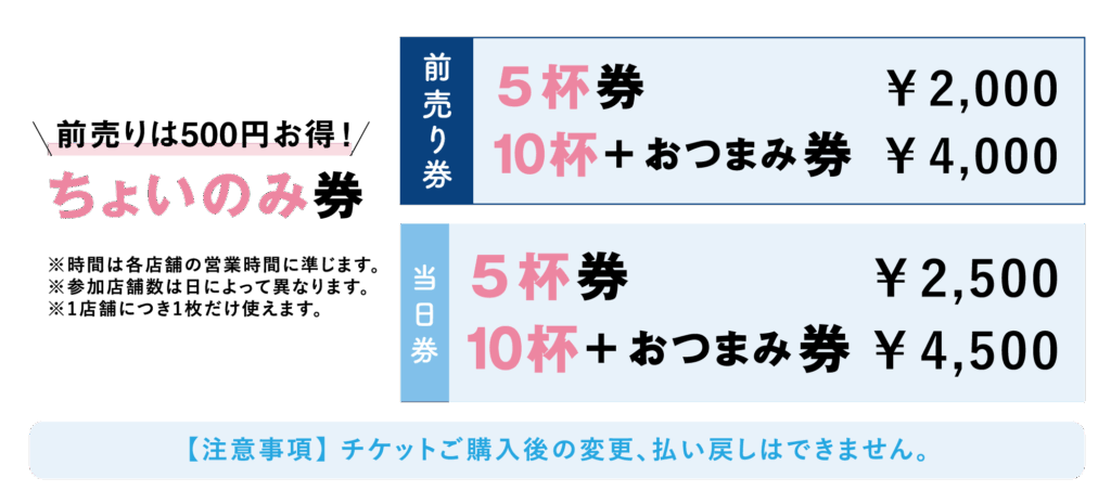 「ちょいのみ券」は “5杯券” と “10杯+おつまみ券” の2種類があります。開催期間中に使い切ればOKなので、ご自身のペース、ご都合に合わせてお選びください。